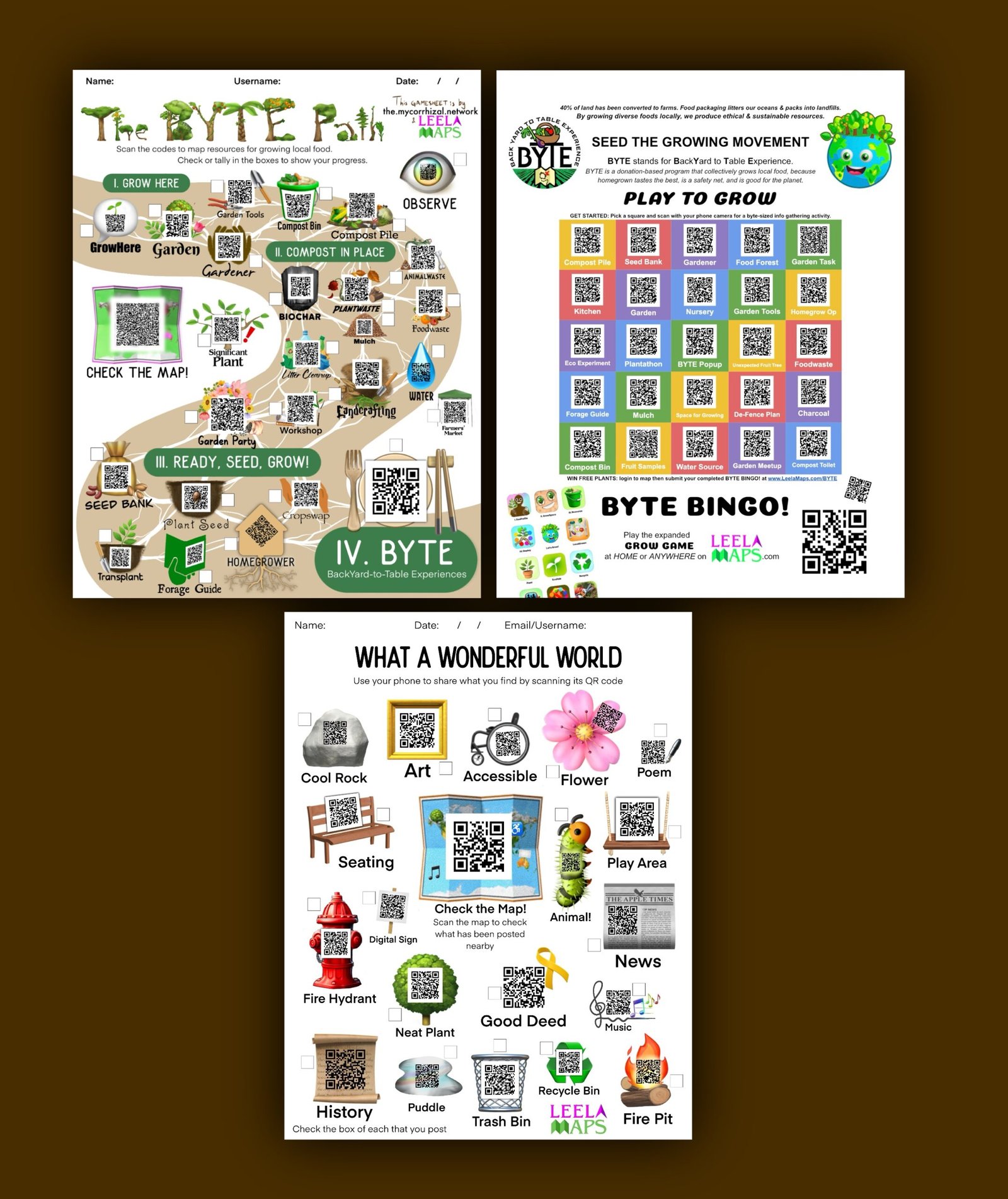 Get 2 BYTE game sheets that guide players to share local ecofriendly resources. BONUS “What a Wonderful World” activity sheet for sharing helpful & inspiring information in one’s neighborhood.